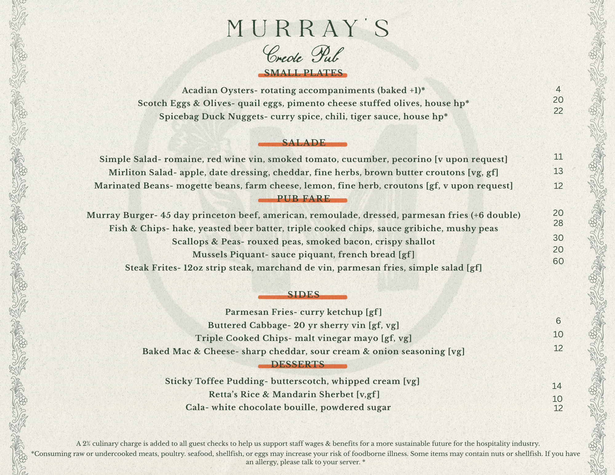 Murray’s Creole Pub Sample Menu